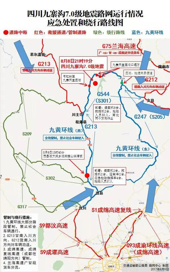 交通部发布九寨沟地震应急处置和绕行路线(图)