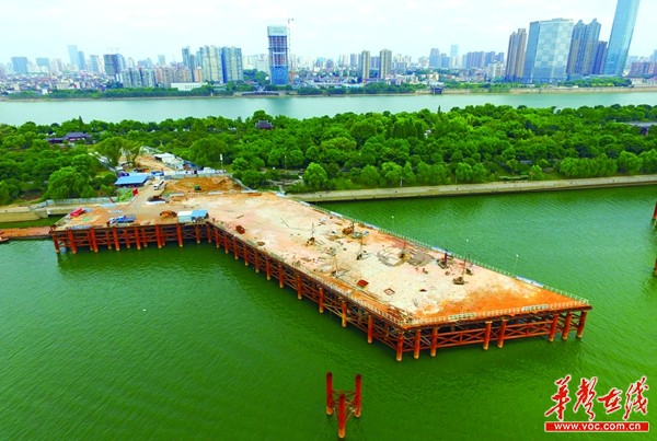 下午两点,记者在橘子洲景区内往洲头方向行走,到梅园附近时,可以看到湘江西汊里出现一片近六千平方米的橘色施工平台。