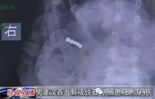 九岁少年在玩耍时不小心将吸铁石吞进肚子里,家长直到这些隐形“炸弹”磨穿肠壁,部分肠壁已经穿孔坏死后,才发现。