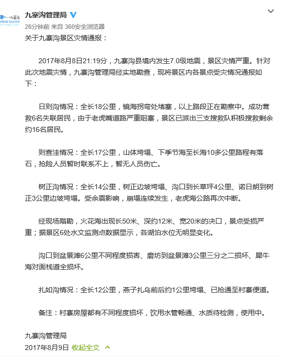 关于九寨沟景区灾情通报: