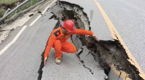 四川省国网电力公司前方救援人员发回的视频显示,公路路面被地震破坏,产生约两米深巨坑,震后甘海子公路现深约2米裂缝。