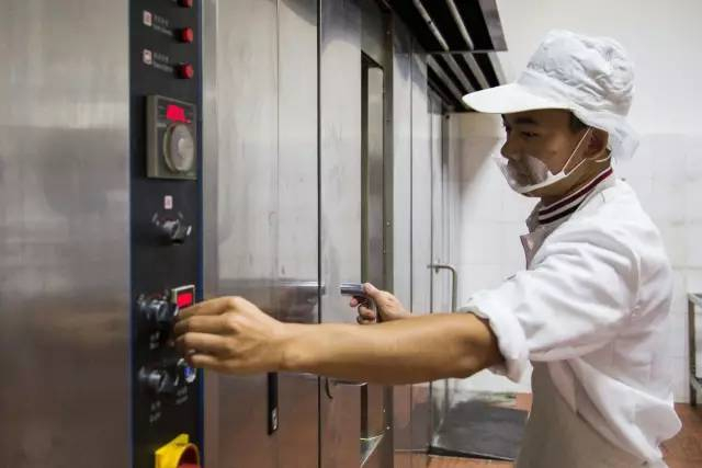 烘烤是月饼制作最关键的一步,一个个手工制作好的月饼被整齐地码在烤盘里,两名工人配合,把一整架月饼推进烤炉,关上门,调好温度、时间……月饼的“蜕变之旅”开始了。