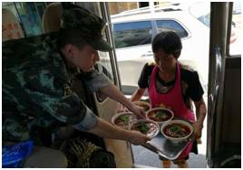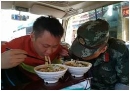 奔波了一夜,支队救援官兵是又困又乏又饿。这时旁边饭店的一位阿姨端着几碗热腾腾的牛肉面,来到支队救援官兵的面前,不管官兵如何推辞,就是要让战士们把面吃下。