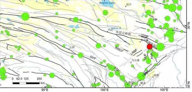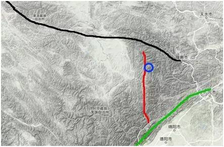 (红色是岷江断裂带,黑色是东昆仑断裂带,绿色是龙门山断裂带,蓝色圈是本次地震震中)