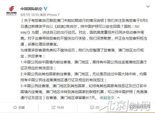 8月6日,一篇题为《战狼2告诉你,持中国护照可以安全回国?国航:No way!》网帖,引发关注。文章作者称,12人旅游团,持中国护照,在购买巴黎经停北京前往澳门机票后,“因有人未携带港澳通行证及续签,被中国国际航空公司(简称国航)拒绝登机”。