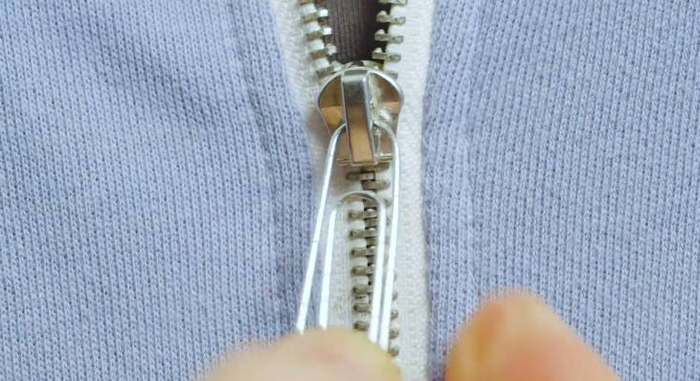 金属的拉链用久之后,拉头便会松动,口径随之变大,就不好拉上了。用镊子夹住拉头的尾部,将其夹紧,不要太用力夹断了就不好了。