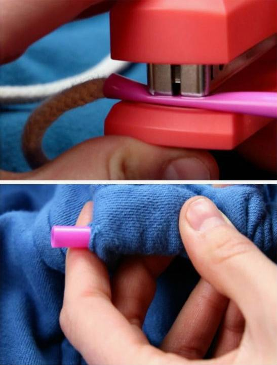 一些带拉绳的衣服绳子容易抽出,很难再塞回去。其实只需要一根吸管和订书器就能解决。如图,用订书机将绳子和吸管订在一起,然后把吸管穿进衣服里,从另一头抽出来。