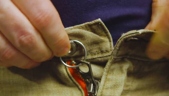 裤子上的拉链老往下滑怎么办?准备一个钥匙环,穿在拉片上,接着将钥匙环扣在裤子扣子上,就不会再往下滑了。