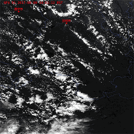 8月9日14:00-15:00,GF-4号卫星拍摄的四川地震区云系观测,1分钟频次、50米分辨率。