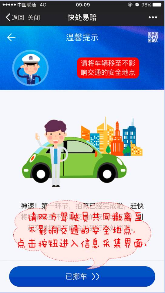 请双方驾驶员共同撤离至不影响交通的安全地点,点击按钮进入信息采集界面。