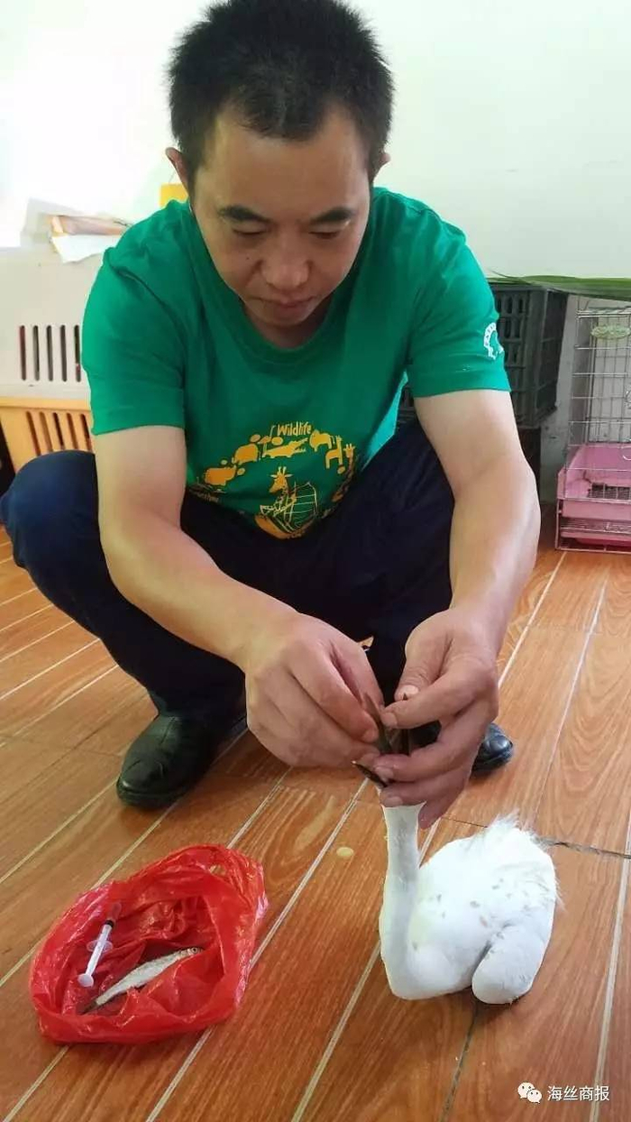 从事动物医治20多年的陈章强轻轻抓起白鹭,仔细检查了它的脚、脖子,初步诊断显示,白鹭病得很严重。
