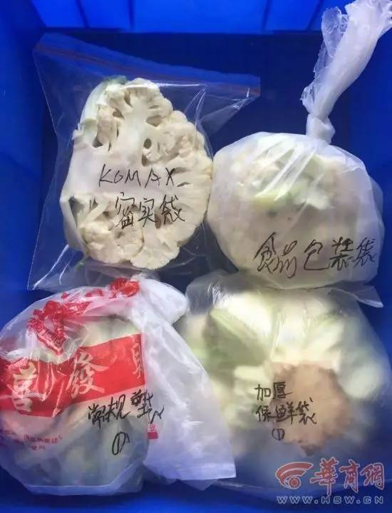 华商报记者从超市购买价位不同的、原料均为PE聚乙烯的2种食品保存袋、抽取超市货架旁连卷塑料袋(均标有“食品专用袋”),分别装上从蔬菜市场不同摊位购买青菜、黄瓜、菜花、娃娃菜和青椒5种蔬菜,每种蔬菜购买后都有塑料袋包装,塑料袋有黄色、白色等。
