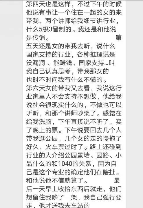 他说:“为何人家xx大学的都可以做你不能做,你很牛逼?你看到什么了?我什么都没做。”我直接吼道:“传销的事情我不干”,楼下正好有几个保安看了过来,我说你赶紧给我开门,他打开了小区的门。