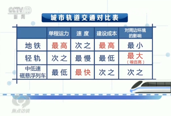 地铁的单程运力最高,中低速磁浮列车的运力最低;从速度上看,中低速磁浮列车速度最快,而轻轨的速度最慢;而从对周边环境的影响上看,地铁因为在地下运行,影响最小,而轻轨因为噪音较大,对我们的生活影响比较大;而从建设成本上来看,地铁的成本最高,中低速磁浮远低于地铁,略高于轻轨。