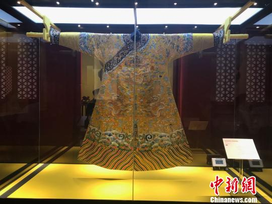 图为明黄色缎绣彩云蝠寿金龙纹男棉龙袍 胡哲斐 摄