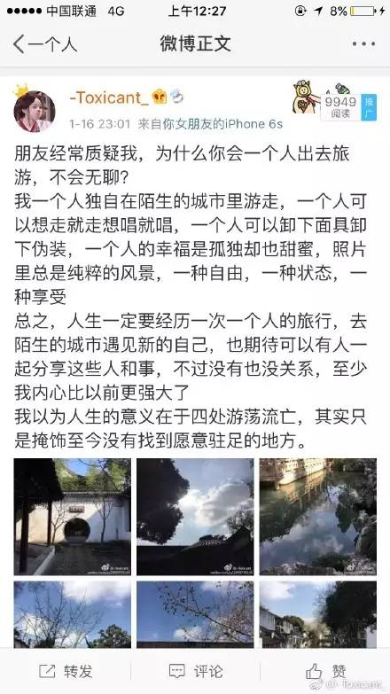 @小涂先生hello:一个人去过武汉,在武汉火车站被人骗过,一个人在重庆吃火锅吃到胃疼,一个人在西安吃遍一条回民街,一个人在凤凰寻找过自我,一个人在张家界被玻璃栈道所震撼,一个人坐了17个小时的火车去看偶像周杰伦的演唱会,一个人在郑州因为人少点不了特色菜,和我在成都的街头走一走灯还没开始灭你就累了。