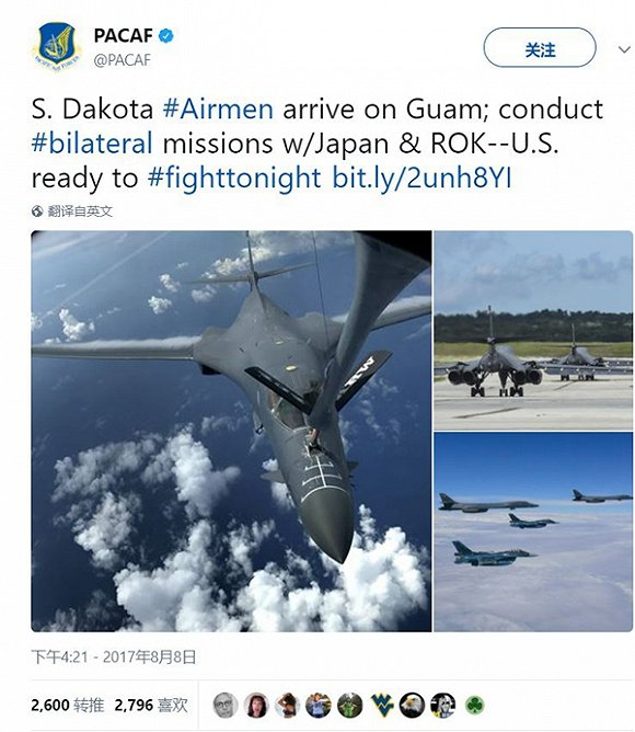 去年8月,美国的B-52、B-1与B-2轰炸机首度齐聚关岛空军基地;本周一晚,两架B-1轰炸机从关岛起飞后抵达朝鲜半岛东部海域上空,与韩国和日本举行联合军演。