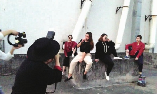 在大敏工作室的外景场地,大码模特经纪人正在为客户拍摄中国风服装图片。