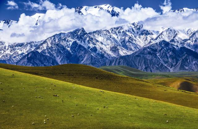 幸亏有了天赐的新疆,天赐的纬向山系。在干旱的欧亚大陆内部,三条巨大的山系挺拔向苍天,从大气环流中截留了宝贵的水汽,化作山间的涓涓溪流,在山脚下滋润了如珍珠一般的点点绿洲。