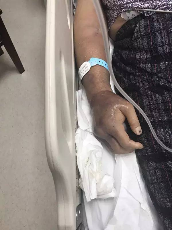 来的时候,黄大妈的意识还是清醒的,但是人已经非常虚弱,右手从手背到手肘肿的很厉害,皮肤颜色呈暗青色,还有许多水泡,有些水泡已经破溃流脓。急诊医生检查发现,黄大妈右手虎口处有破溃,伤口大面积感染,白细胞急剧下降,已经发展脓毒血症,很快陷入了昏迷状态。