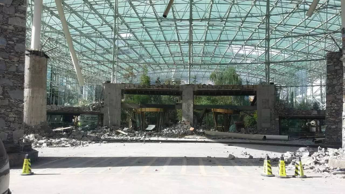 九寨天堂洲际大酒店被震得满目疮痍,到处都是客人逃生时留下的物品(甘肃消防供图)