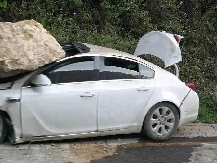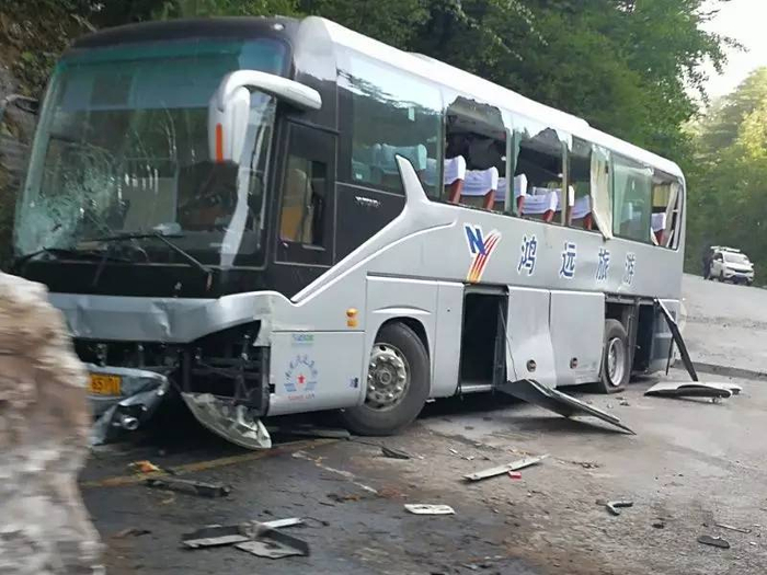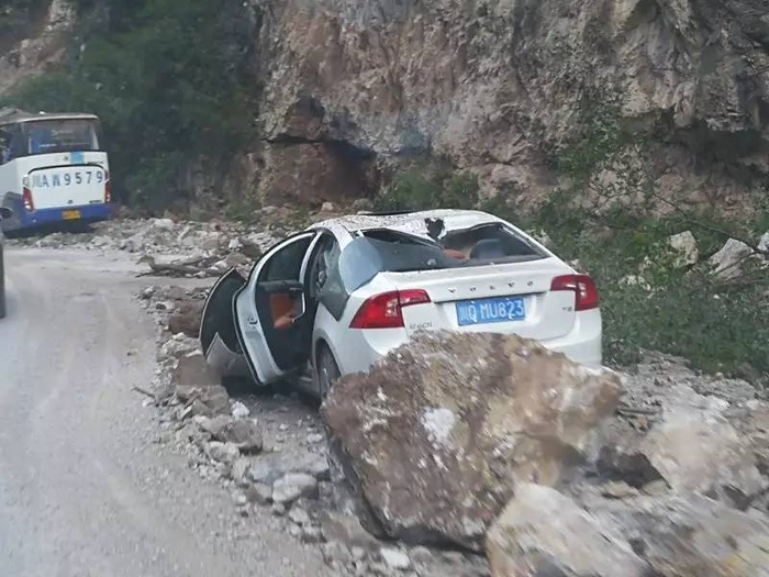 凌晨2点,我们第一次试图进入受灾核心区域,行进中,沿途处处散落着巨石,路边的大巴车被砸得面目全非。在我们开车进入灾区的路中,不断有余震发生,还能清除听到石头落下的声音,再加上是深夜,为保障安全,救援队决定撤回沟口。