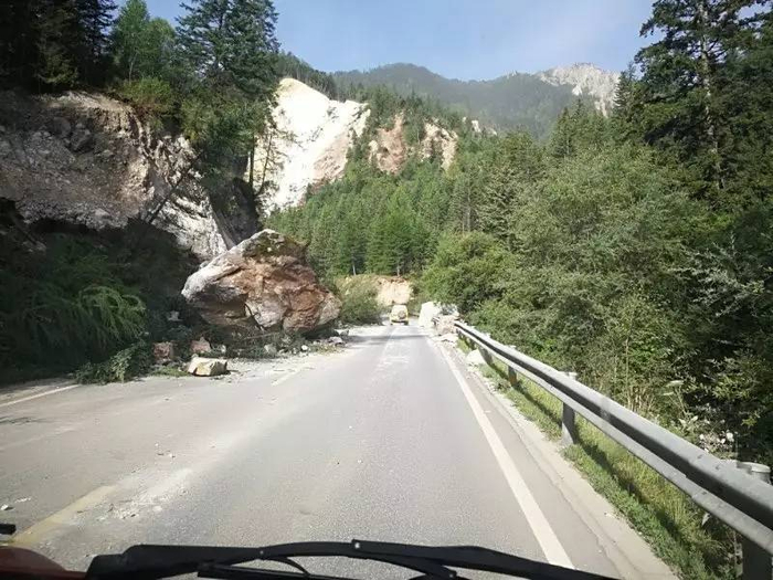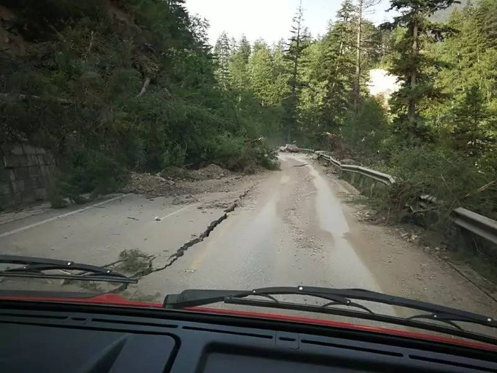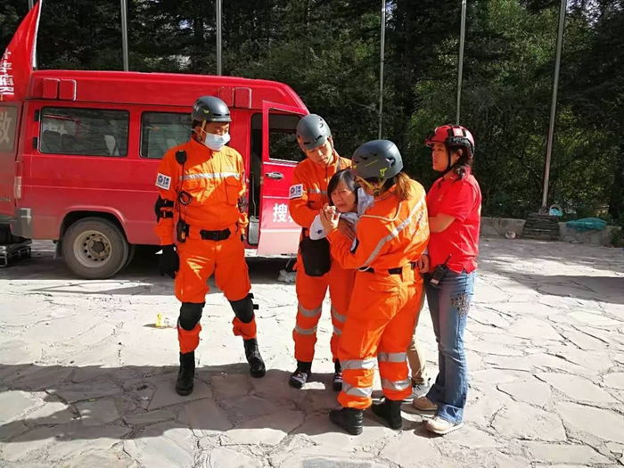 一阵跋涉后救援队终于抵达沟口,此处受灾情况比较严重,路边车辆多被落石砸翻。救援队员们看见,进入景区长约1公里的路上,大多数商户都已关门,仅剩一家药店、一家小超市、一家刺绣店还在营业,刺绣店的老板还给救援队员送来茶水,缓解疲劳。交流中商户告诉我们,地震发生时感觉到明显的摇晃,很害怕,但由于经历过5·12汶川地震,所以总体来说能够冷静面对。