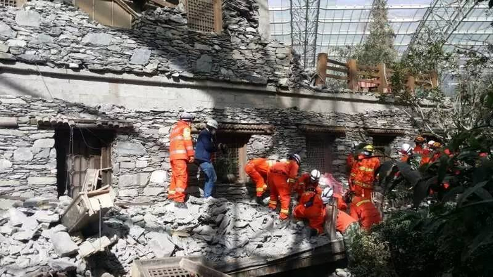 甘肃甘南消防官兵目前仍在九寨天堂洲际大酒店逐层逐室搜寻有无被困人员(甘肃消防供图)