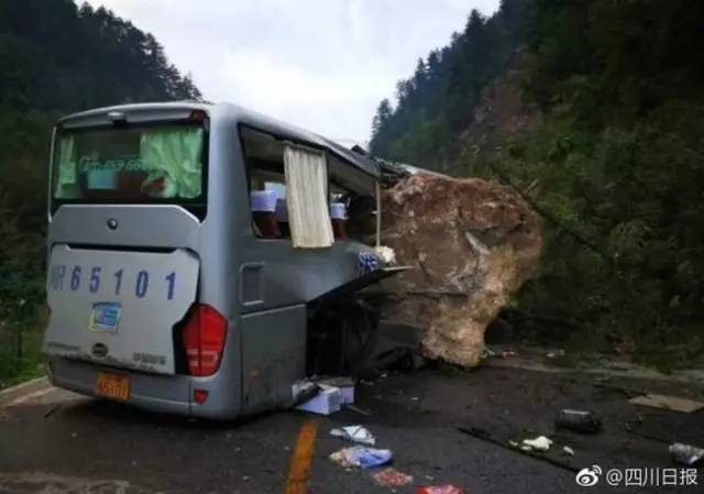 8月8日晚上,31名游客做上大巴车,离开九寨沟口返回酒店。在地震的瞬间,巨石滚落,砸中坐在这辆大巴车尾部的一对湖北夫妇。