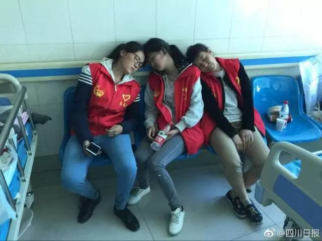 在九寨沟县人民医院,三名志愿者靠在一起睡着了。她们是母女三人,妈妈叫杨明珍,两个女儿分别是袁菁、袁榕。地震后,惊魂未定的她们选择来到九寨沟县人民医院当志愿者,帮病人取药、送水,帮助搭建帐篷、铺床,陪伴着情绪激动的伤员……一晚上,这个志愿者家庭都没有合眼。