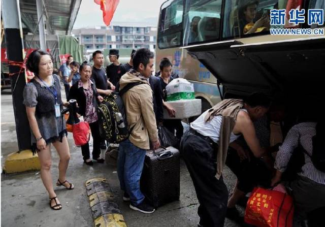 ▲8月9日,在绵阳市平武县平武汽车客运站,因地震从九寨沟撤出的旅客转乘客运大巴返回成都、绵阳等地。