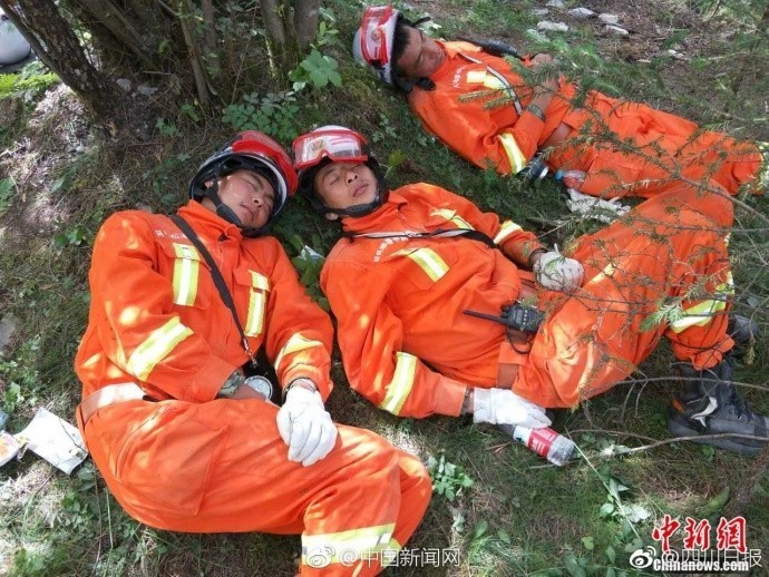 连续奋战18小时后,阿坝消防官兵利用吃饭间隙,打个盹,养足精神,他们又即将投入到救援中去。