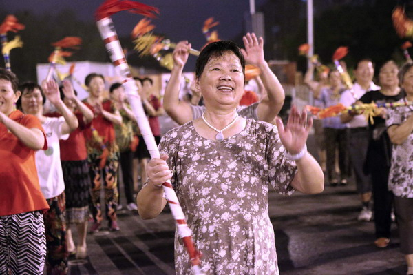 8月4日,上海大妈挥舞着竹竿跳广场舞。视觉中国 图