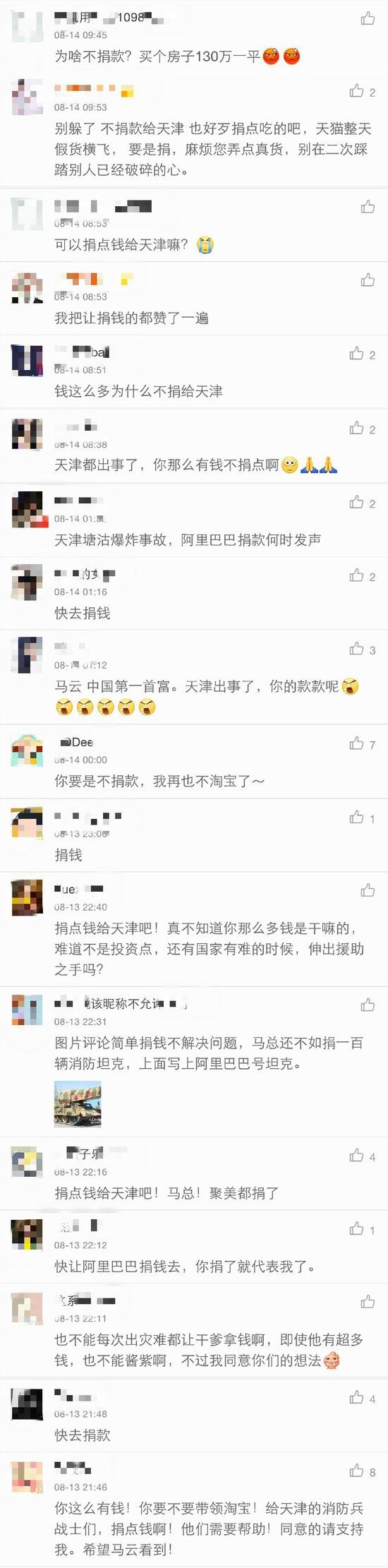 2015年天津港爆炸事故发生后,有不少网友到马云微博底下留言,指责马云“为什么不给天津捐款”,“首富就应该捐1个亿”,“你捐了就等于我捐了”,“你不捐款,我再也不淘宝了”……