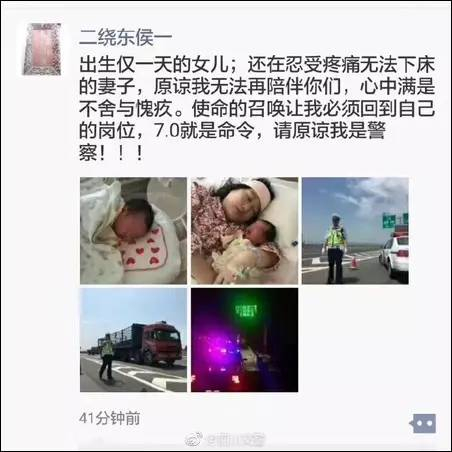 @四川交警 9日分享了另一位警察的故事:他的孩子也才出生一天,但他不得不离开:使命的召唤让我必须回到自己的岗位,7.0就是命令,请原谅我是警察!