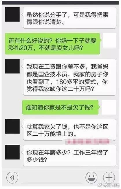 @哒白兔白又白:女人嫁人生娃带娃何止这区区二十万可以抵的,彩礼少了男方乐死了觉得理所当应当的,多了就说卖女儿,什么心态。