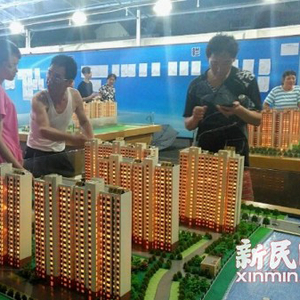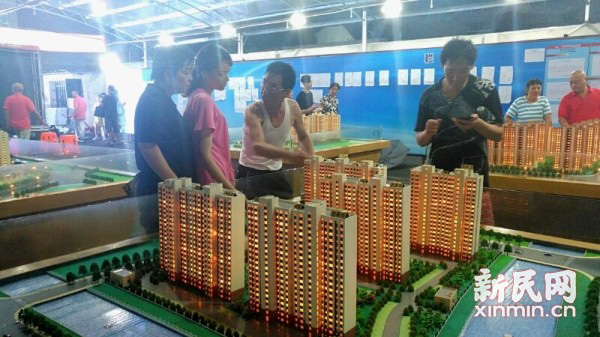 蒋家浜基地的居民在看旧改安置房源模型。新民网 图