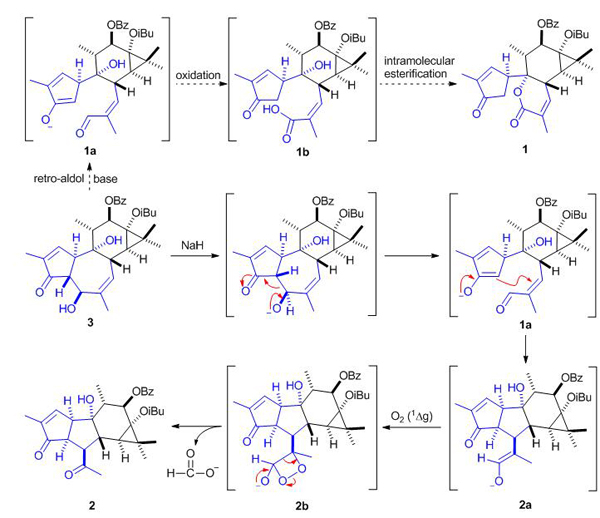 中国科学院昆明植物研究所植物化学与西部植物资源持续利用国家重点实验室黄胜雄研究组与云南师范大学赵勇研究组合作,在对大戟属植物蒿状大戟(Euphorbia dracunculoides)的研究中,新发现了一个具有新型碳骨架的Tigliane类二萜 (1, 图1),它具有6/6/3-三环合并2-甲基-2-环戊烯酮的内酯结构。研究通过广泛的NMR数据分析、ECD计算实验确定了其精确构型,发现它与蒿状大戟中的一个Tigliane类主要成分3 (Tetrahedron, 2015, 71(34), 5484–5493)有很高的结构相似性,据此,黄胜雄研究组提出了该化合物可能的生源合成机制,主要经由碱催化下的retro-aldol开环,氧化和酯化三个步骤 (图2虚线)。据此可能的生源合成机制,研究组开展了化合物1的仿生转化研究,在系列失败的尝试后,研究组意外得到了另一个具有新颖5/5/6/3四环骨架的一降二萜 (2, 图1)。研究同样通过NMR数据分析、ECD计算及X-ray衍射实验证实了其确切结构。接下来,研究组对化合物2的合成转化机制进行了探索,发现它可能是由前体3在强碱NaH的作用下拔氢形成醛中间体,再经由串联的Michael加成形成5/5/6/3四环母核,最后形成的烯醇中间体与单线态氧发生1,2-环加成,以甲酸的形式失去一个碳原子(图2实线)。其中,关键步骤与氧分子的1,2-环加成由模式醛类化合物与18O2的标记实验进行了验证,填补了此类反应机理提出几十年来缺少直接证明的空白。