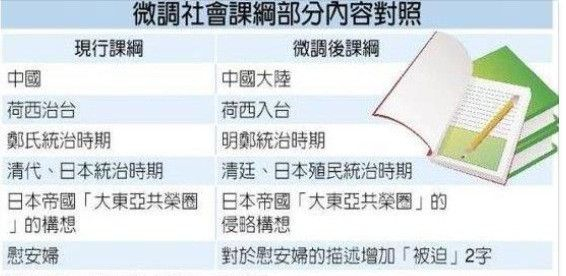 台湾最近对课纲的一次修改是今年7月3日,台湾“教育研究院”又正式公布了“12年‘国教’社会领域课纲草案”。其中高中历史的中国史部分被大改:废除中国史,将之并入东亚史,把历史课纲从现在的台湾史、中国史、世界史,改成台湾史、东亚史、世界史。
