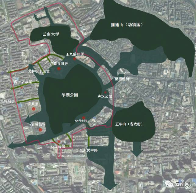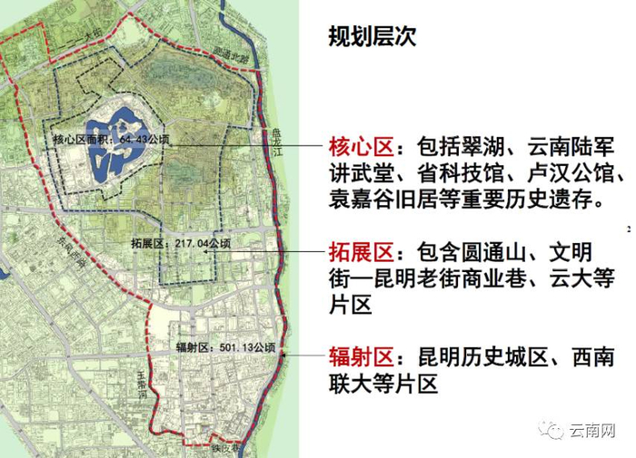 工程将以翠湖周边片区(包括翠湖、云南陆军讲武堂、省科技馆、卢汉公馆、袁嘉谷旧居等重要历史遗存)为核心,拓展至圆通山、文明街-昆明老街商业巷、云大等片区,规划面积约2.27平方公里,其中进行提升改造建设的面积约0.77平方公里。
