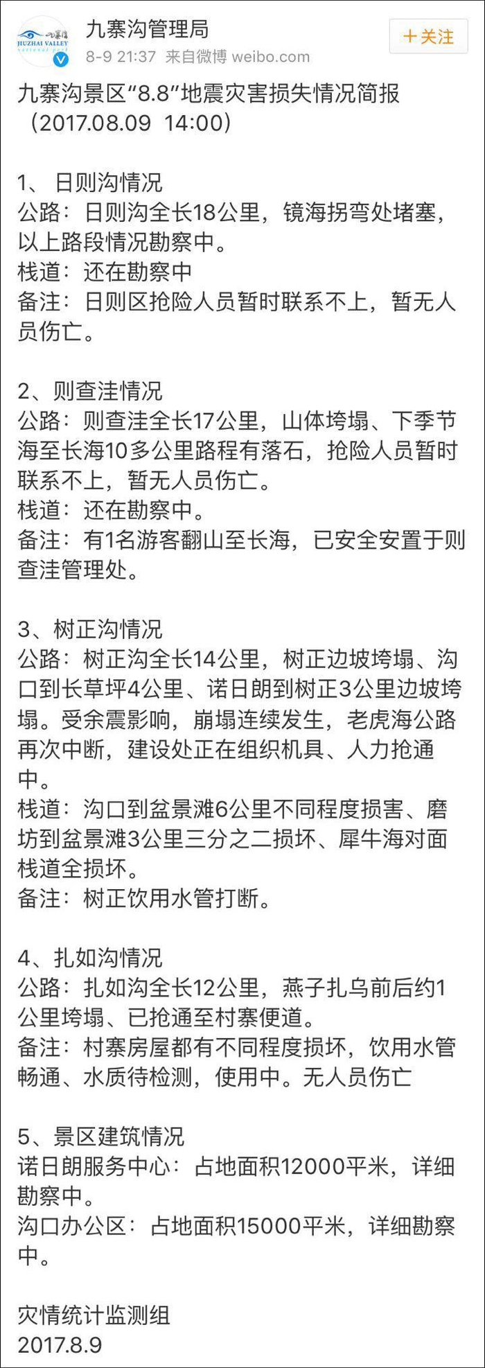 据@九寨沟管理局 官方微博9日发布的“地震灾害损失情况简报”,各个沟内情况如下: