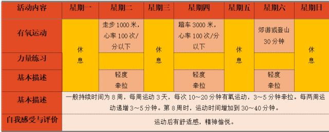 ——运动频度:3天/周,逐渐增加到5天/周。