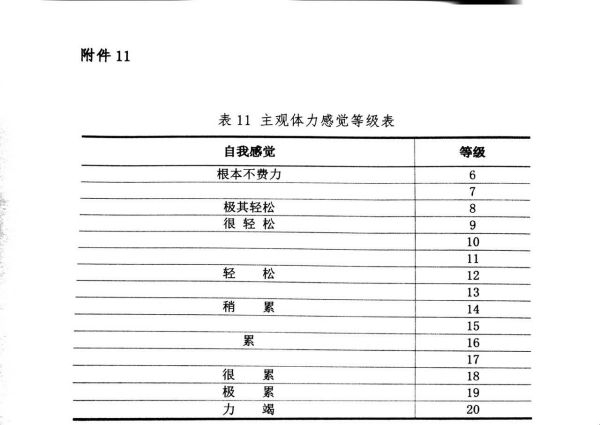 人体运动过程中的主观体力感觉可分为6~20个等级,小强度运动的主观体力感觉为轻松(9~10级),中等强度运动的主观体力感觉为为稍累(13~14级), 大强度运动的主观体力感觉为累(15~16级)。