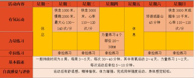 初期体育健身活动的时间约为8周,具体方案为: