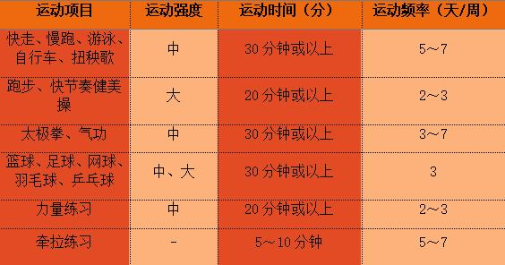 ——运动强度:中等强度运动相当于60%~80%最大心率,大强度运动达到80%以上最大心率;力量练习采用10~20RM负荷,重复10~15次;各种牵拉练习。