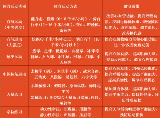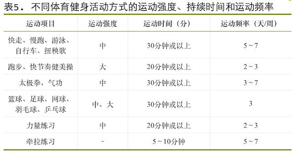 ——运动方式:中等强度有氧运动、球类运动、中国传统运动方式、柔韧性练习。