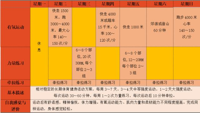 在这一阶段,体育健身活动方案基本固定,逐步过度到长期稳定的体育健身活动方案。中期体育健身活动方案举例见下图。