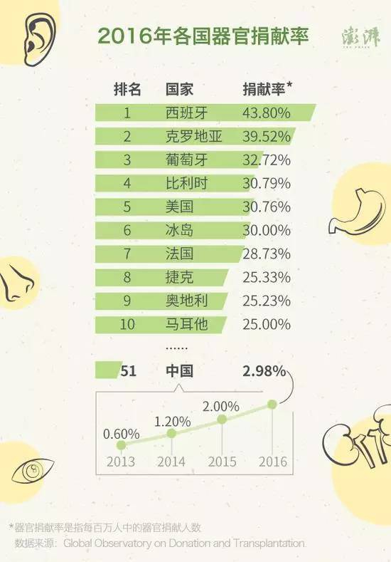 虽然近几年,中国的器官捐赠率在不断提高,在世界上的捐赠率排名也在不断进步,然而在2016年,中国的捐赠率也仅为2.98,这意味着每一百万人口中,只有将近3人会在死后自愿捐献器官。