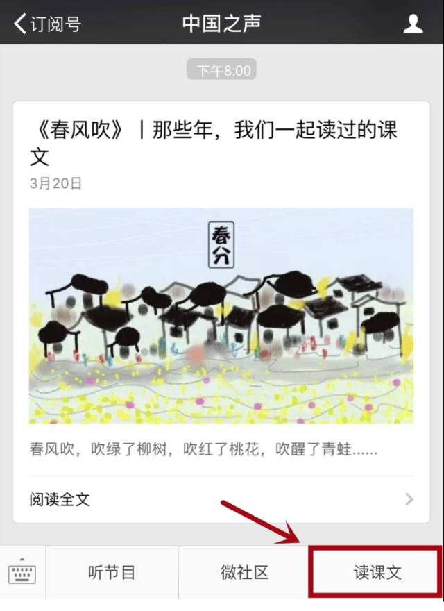 直接戳文末“阅读原文”,或进入中国之声微信公众号,点击底部菜单栏“读课文”↓