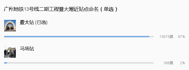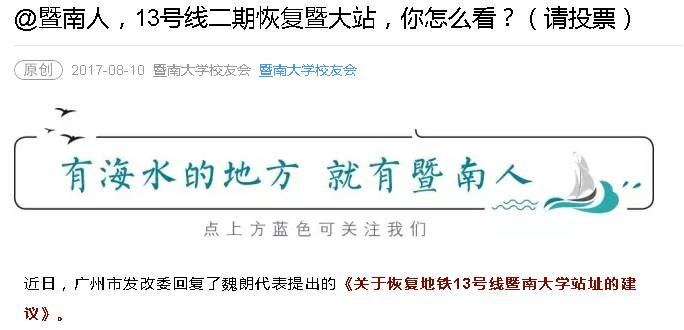 关于这个站址命名该不该用暨大校名,也在网络上迅速发酵。昨天暨大校友会官方微信发起投票,截至今天下午三时左右,投票人数已经超过1.5万人,其中,赞成暨大站的占97%。